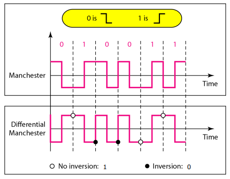 동기화(Self-Clocking)도 지원한다. 마찬가지로 각 비트마다 신호의 전이가 발생하기 때문.