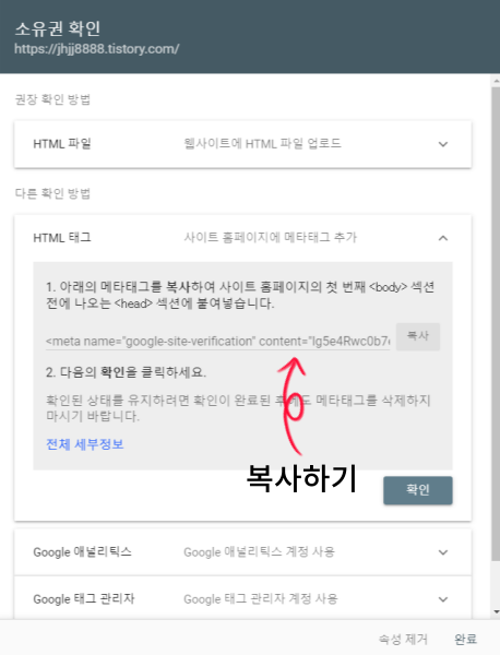 HTML 태그를 통해 블로그의 소유권을 확인했다.