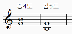 위의 그림은 파-솔-라-시로, 반음을 포함하고 있지 않아 간격이 넓어진 게 되어서 증4도입니다.